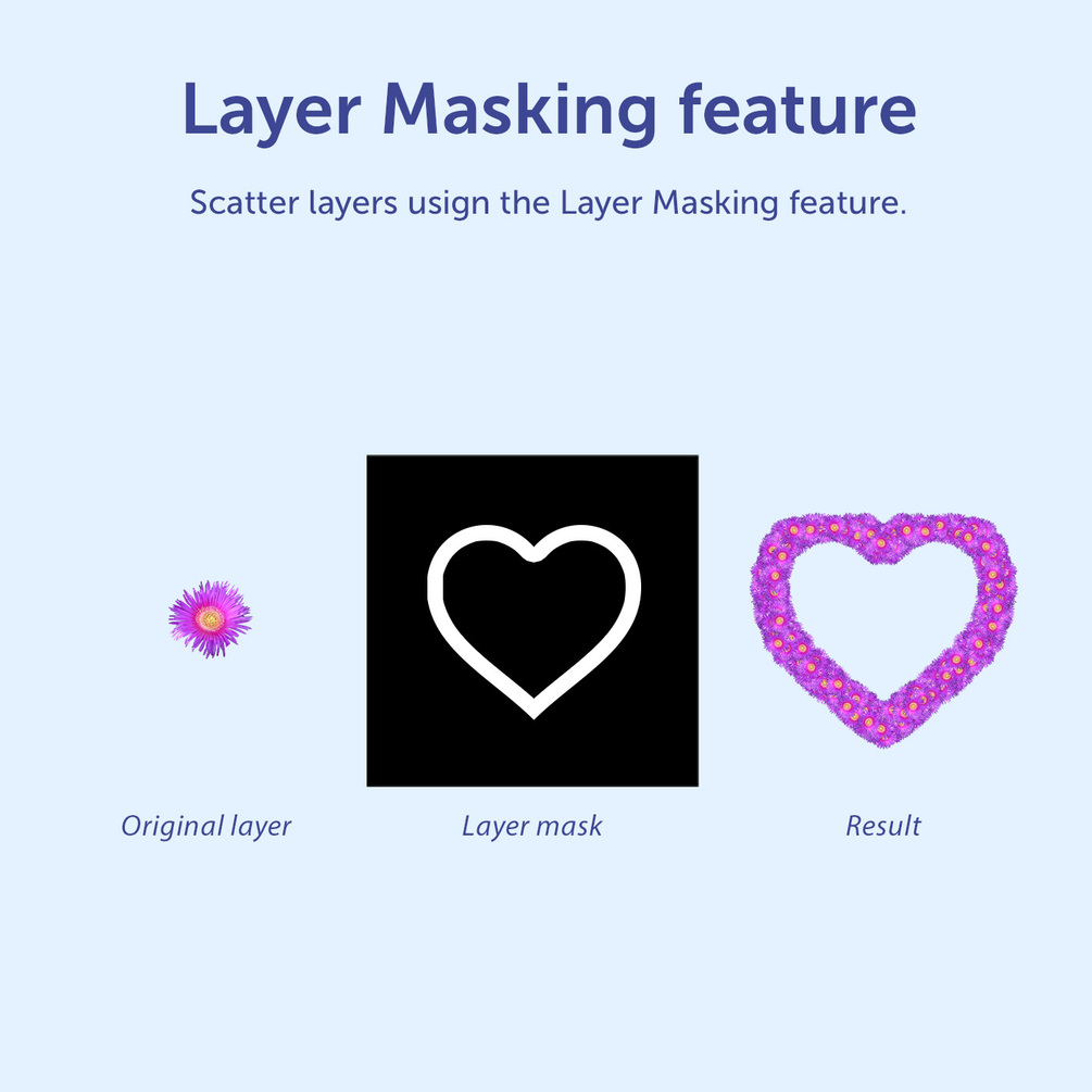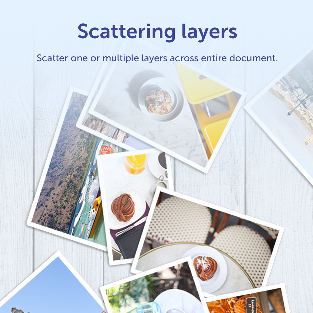 - Scatter layers across the entire document, selection or using the ”Masking” feature